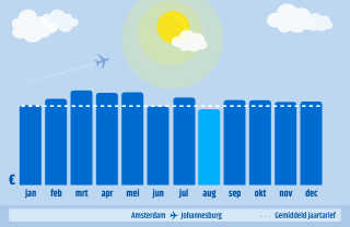 Johannesburg is het economische hart van Zuid-Afrika en een moderne en bruisende wereldstad. In Johannesburg vind je veel bezienswaardigheden, gecombineerd met een prachtige natuur. Je bent het goedkoopste uit als je in augustus boekt en vertrekt in november.