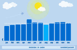 De gestippelde witte lijn is het gemiddelde tarief voor de route over het hele jaar. De blauwe balkjes staan voor de gemiddelde ticketprijs in die maand.