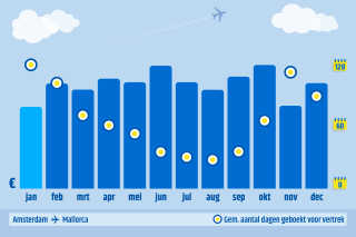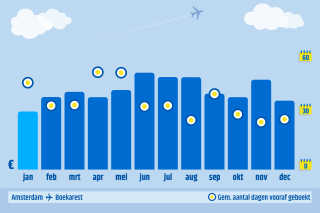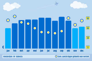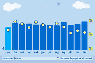 De blauwe balkjes staan voor de gemiddelde ticketprijs in die maand. Deze kun je vergelijken ten opzichte van elkaar. De gele cirkels staan voor het gemiddelde aantal dagen voor vertrek dat mensen boekten. De legenda voor de cirkels vind je aan de rechterkant van de grafiek.