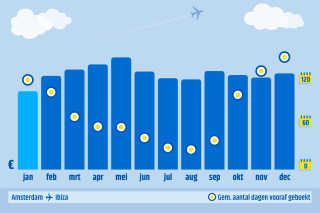 Vroegboek bestemming alert! Ibiza is zo'n typische vroegboekbestemming die je het beste in januari boekt. Een retourticket vanaf Amsterdam kost dan gemiddeld € 160 en dat is maar liefst 122 dagen voor vertrek. Boeken in januari voor tickets met vertek in juni/juli is dus perfect. Terwijl de rest van het land nog rilt in de winterkou, kan jij al vooruit kijken naar de zomervakantie. Last-minute boeken voor de zomer in mei kost je gemiddeld € 70 per ticket meer.