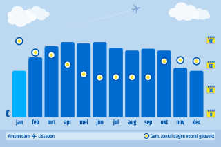 Ticketprijzen liggen gemiddeld hoger voor en tijdens de zomer met vertrek binnen 1-2 maanden. In de laatste maanden van het jaar zakt de gemiddelde ticketprijs naar Lissabon weer en wordt er langer vooraf geboekt. Vroegboeken loont dus!