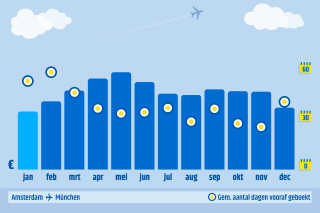 Bijzondere architectuur, gezellige sfeer en een prachtige omgeving: München is zeker de moeite waard. Een retourticket vanaf Amsterdam kost gemiddeld € 219 als je boekt in januari. De voordeligste optie is dan om te boeken voor 51 dagen later, ongeveer in de voorjaarsvakantie. Als je München wilt bezoeken is boeken in januari de beste optie, want in de lente worden tickets gemiddeld alleen maar duurder. Sla dus je slag!