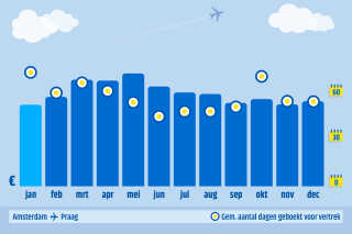 Vliegen vanaf Amsterdam naar Praag kan gemiddeld voor € 199 als je boekt in januari. Dit is ook met vertrek in maart. Amsterdam als vertrekluchthaven kan dus voordelig zijn, als die luchthaven voor jou makkelijker te bereiken is dan het zuiden van het land. In de late lentemaanden liggen de prijzen voor retourtickets vanaf Amsterdam wel een stuk hoger, namelijk rond € 270 in mei en juni. Dat komt omdat dan veel mensen relatief last-minute boeken voor de zomer, en dat is bij een bestemming als Praag niet voordeliger.
