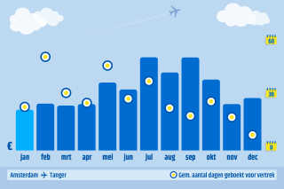 Tanger in Marokko is populair vroeg in het jaar. In januari betaal je gemiddeld € 265 voor een retourticket met vertrek in februari vanaf Amsterdam. In juni en juli betaal je gemiddeld zelfs € 600 voor een retourticket! Dat komt omdat er in die periode veel last-minute voor de zomervakantie geboekt wordt. Door de grote vraag stijgt de prijs enorm! Je kunt je tickets dus beter aan het begin van het jaar op de kop slaan. Februari, maart en april zijn ook nog voordelige maanden om vliegtickets te boeken naar Tanger. Tickets naar Tanger worden over het hele jaar trouwens relatief kort vantevoren geboekt. In december zelfs gemiddeld maar 8 dagen voor vertrek!