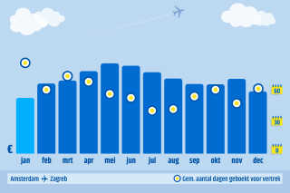 De levendige hoofdstad van Kroatië is een leuke stedentrip! In januari boek je jouw retour vliegtickets naar Zagreb voor gemiddeld € 234. Dat is het goedkoopste van alle maanden in het jaar. In de duurste maand mei betaal je zelfs € 381! Tickets geboekt in januari hadden een vertrek in eind maart of begin april. Dan ben je het voordeligst uit.