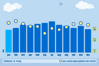 Verken de karakteristieke straten en pleinen van het bruisende Praag. Vanaf Eindhoven is een retourticket € 138 als je boekt in januari. Dat is € 50 goedkoper dan in de duurste maand juli. Boekingen in januari vertrokken gemiddeld 76 dagen later, dus in maart.