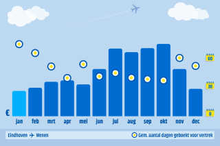 Vanaf Amsterdam betaal je in januari voor een retourticket naar Wenen gemiddeld € 239. Dat is dik € 40 goedkoper dan in de duurste maand om te boeken, juni. In januari boeken is het meest voordelig als je vertrekt net na de voorjaarsvakantie.