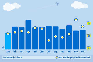 Valencia, de prachtige Spaanse stad! Boek jouw tickets in januari, want voor 2 luchthavens is dit de goedkoopste kans die je gaat krijgen. Een retour ticket met vertrek vanaf Rotterdam kost je in januari gemiddeld € 184, inclusief toeslagen en evt. bagage. 74 dagen voor vertrek is de sweetspot, dus vertrek in maart/april. Vliegen vanaf Amsterdam is zelfs goedkoper als je in januari gaat boeken, namelijk € 152! Bekijk dus voor jou wat de voordeligste vertrekluchthaven is (benzine of een treinkaartje is immers ook niet gratis).