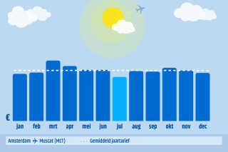 Voor prachtige moskeeën, grote paleizen, gezellige souks en interessante musea ga je naar deze hoofdstad van Oman. Maak bijvoorbeeld een mooie rondreis! >> Als je goedkoop naar Muscat wil vliegen, boek je een vlucht voor een vertrek in oktober. Dan zij de prijzen gemiddeld het goedkoopste. Daarnaast kun je ook wachten tot december, dan zijn de prijzen vaak ook lager dan gemiddeld.
