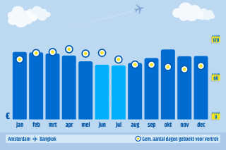 Bangkok is een van de populairste bestemmingen ter wereld. Juni is de tijd om toe te slaan voor de goedkoopste vliegtickets. In juni boek je jouw vliegtickets voor gemiddeld € 836! (inclusief alle toeslagen). Juli is ook nog een goede tijd om te boeken. Daarna worden de tickets fors duurder. In oktober betaal je zelfs meer dan € 1000 gemiddeld voor een retour.