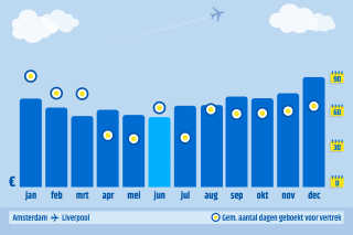 Voor een retourticket van Amsterdam naar Liverpool betaal je in juni gemiddeld € 150. Deze tickets worden gemiddeld 70 dagen voor vertrek geboekt dus je vertrekt dan in augustus. In juli vliegt dat omhoog naar gemiddeld € 174! Dat zijn dan voornamelijk last-minutes voor augustus, dus eerder boeken naar Liverpool loont. In december kosten tickets naar Liverpool gemiddeld het meest. Deze tickets hebben vertrek in de voorjaarsvakantie.
