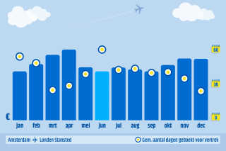 Waar je in mei het beste vanaf Eindhoven naar Londen Stansted kon boeken, is dat in juni vanaf Amsterdam naar Londen Stansted. Vliegtickets retour zijn dan gemiddeld € 138 (inclusief alle toeslagen). Tickets in juni worden ruim voor vertrek geboekt, namelijk gemiddeld 60 dagen voor vertrek. Zo boek je dus het voordeligst voor de laatste weken van de zomervakantie. Tip: over het hele jaar genomen is vliegen vanaf Eindhoven naar London Stansted vaak goedkoper. Je kunt in onze zoekresultaten gemakkelijk alternatieve vertrekluchthavens in Nederland bekijken.