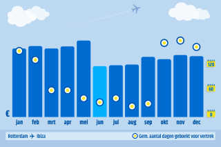 De blauwe balkjes staan voor de gemiddelde ticketprijs in die maand. Deze kun je vergelijken ten opzichte van elkaar. De gele cirkels staan voor het gemiddelde aantal dagen voor vertrek dat mensen boekten. De legenda voor de cirkels vind je aan de rechterkant van de grafiek.