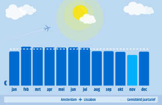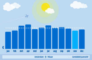 De gestippelde witte lijn is het gemiddelde tarief voor de route over het hele jaar. De blauwe balkjes staan voor de gemiddelde ticketprijs in die maand.