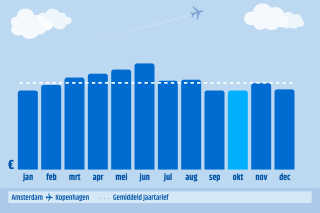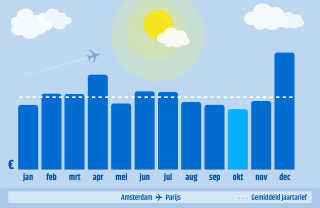 De gestippelde witte lijn is het gemiddelde tarief voor de route over het hele jaar. De blauwe balkjes staan voor de gemiddelde ticketprijs in die maand.