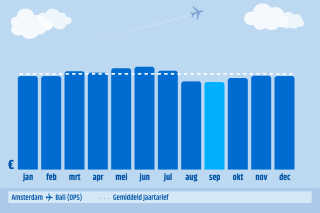 Boeken naar Bali in september kan ervoor zorgen dat je wel €200 goedkoper uitbent dan in de duurste maand om te boeken, juni. Boeken in september doe je zo'n 105 dagen voor vertrek, dus je vertrekt dan in januari. Dit in het regenseizoen op Bali. Door de luchtvochtigheid voelt het dan warmer aan en regent het meer, maar het kan nog steeds heerlijk weer zijn op het eiland. Geniet dus van het vele groen in deze periode!