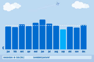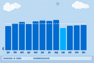 De gestippelde witte lijn is het gemiddelde tarief voor de route over het hele jaar. De blauwe balkjes staan voor de gemiddelde ticketprijs in die maand.