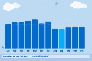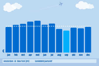 In het najaar boeken naar New York komt voordelig uit. September is namelijk de gemiddeld goedkoopste maand om te boeken naar zowel John F. Kennedy Airport als Newark Airport.