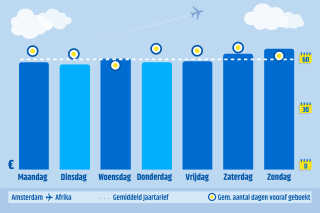 Op dinsdag en donderdag boek je de goedkoopste tickets naar Afrikaanse bestemmingen. Vermijd je liever de duurdere tickets, boek dan liever niet op zondag. Ook woensdag en zaterdag zijn gemiddeld wat duurder. Net als voor Amerika, is boeken op doordeweekse dagen het gunstigste als je 63 dagen van te voren boekt, maar boek je in het weekend, kijk dan liever nog wat verder voor vertrek, namelijk tussen de 70 en 74 dagen voor vertrek.