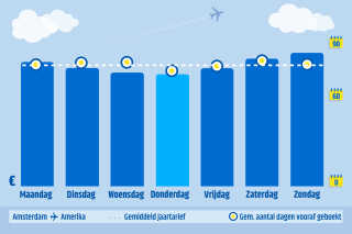Net als voor Europese en Aziatische bestemmingen, zit je voor het continent Amerika goed als je op woensdag of donderdag wil boeken. Het gaat hier om de gemiddelde ticketprijs op de betreffende weekdag voor zowel Noord-Amerika als Zuid-Amerika. Het duurst waren zaterdag en zondag. Boek je een vliegticket naar Noord-Amerika of Zuid-Amerika, dan raden we je aan ongeveer 80 dagen van te voren te boeken. Dan ben je het goedkoopst uit.