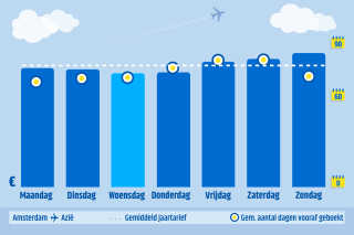 Liever naar Azië? Dan boek je het meest gunstig vliegtickets naar Azië op woensdag of donderdag. Het voordeligst boek je je Azië-ticket 70 dagen voor vertrek. De duurste boekdagen zijn zaterdag en zondag - ben je dan aan het zoeken naar je vlucht, wacht dan nog een dagje met boeken.