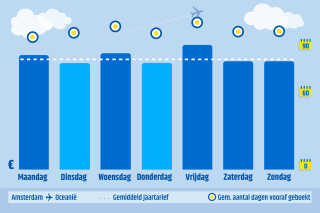 Denk je toch een goeie deal te hebben gevonden op een hierboven aangegeven duurdere dag? Dat kan zomaar! Onze data laten zien hoe je een gunstige ticketprijs kunt vinden, maar het blijven natuurlijk gemiddelden.