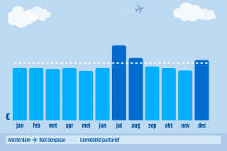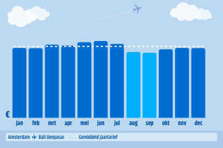 Hieronder laten we je de gemiddelde prijzen per maand van het afgelopen jaar zien. De route gaat van Amsterdam naar Bali Denpasar. Je ziet dat je in augustus en september gemiddeld het voordeligst boekt, maar ook de maanden januari en februari zijn erg voordelig!