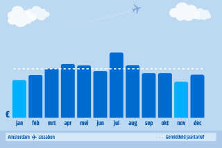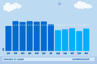 Uit de tabel is af te lezen dat de goedkoopste maanden om naar Lissabon te reizen in 2018 januari en november waren. Wil je liever in het zomerseizoen naar Lissabon vertrekken dan kun je het beste in juni vliegen. De prijs is dan relatief goedkoper dan andere maanden in de zomer. De duurste maand om te vertrekken is juli. Vaak begint de zomervakantie dan ook.