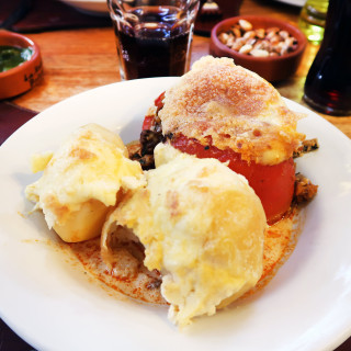 Een typische Peruaanse maaltijd is Rocoto Relleno: een rode peper gevuld met gehakt en kaas en hij wordt geserveerd met een soort aardappelgratin. Verrukkeljk! De saus die onderin je bord ligt is ont-zet-tend scherp (daar houden ze wel van in Peru), maar verder is de maaltijd goed te doen. Het deed ons denken aan de gevulde paprika uit onze studententijd. Lekker!