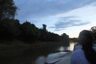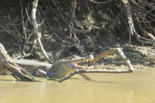 Na een uurtje of 4 varen komen we bij onze lodge aan voor de komende twee nachten. We slapen met twee anderen op een kamer met mosquito net. Gelukkig maar, want het is onderhand een uurtje of 5 en er zitten duizenden muggen! Vergeet dus niet voldoende mosquito spray en het liefst met voldoende DEET. Na even installeren, gaan we met de boot nog op pad om de zonsondergang te kijken en een cerveza te drinken. Op de weg terug gaan we in het donker actieve kaaimannen spotten. Vanuit de boot schijnen we met onze zaklampen op het water. De ogen van de kaaimannen reflecteren het licht. Wat zijn het er veel en wat zijn ze actief vergeleken met de middag! Soms komen we voor ons gevoel veel te dichtbij.