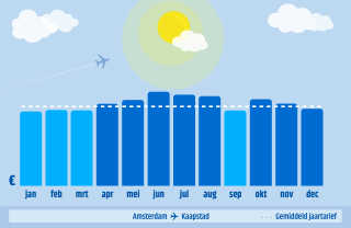 De grafiek is gebaseerd op boekingen op onze website in 2019 met vertrek vanaf Amsterdam. Natuurlijk kan het iets afwijken in 2020 en verder, maar met miljoenen zoekopdrachten per jaar op onze website, is dit een goede indicatie. Al klaar voor je reis naar Kaapstad? Of lees je liever nog verder over voordelig boeken?